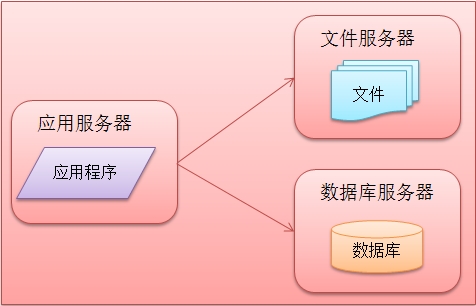 随着网站业务需求的发展,越来越多的用户进行访问,此时一台服务器渐渐不能满足需求,数据的存储空间出现屏障。于是应用程序、数据库、文件三者面临分离,各自为首分配一台服务器,这三台服务器对硬件的要求各取所需,应用服务器处理大量的业务逻辑,需求更快更大的CPU;数据库服务器对数据库的处理需要快速搜索以及缓存,需求对内存更大,对硬盘读写能力更迅速;文件服务器需求放入大量的用户资源,对硬盘空间要求更大。此时的网站的架构组成部分展示如下图