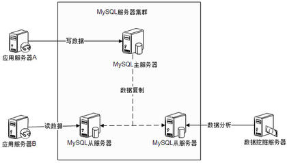 目前各种网站主要使用的关系数据库是MySQL,MySQL支持数据复制功能,使用这个功能可以对数据库进行简单的伸缩。图7为使用数据复制的MySQL集群伸缩性方案。