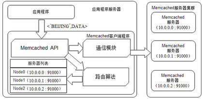 应用程序通过Memcached客户端访问Memcached服务器集群,其中路由算法模块负责根据应用程序输入的KEY计算得到应该访问哪台服务器,然后通过通信模块从对应服务器上读写数据。